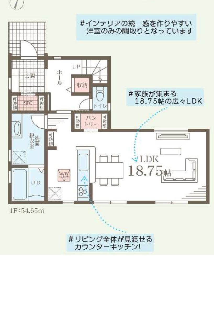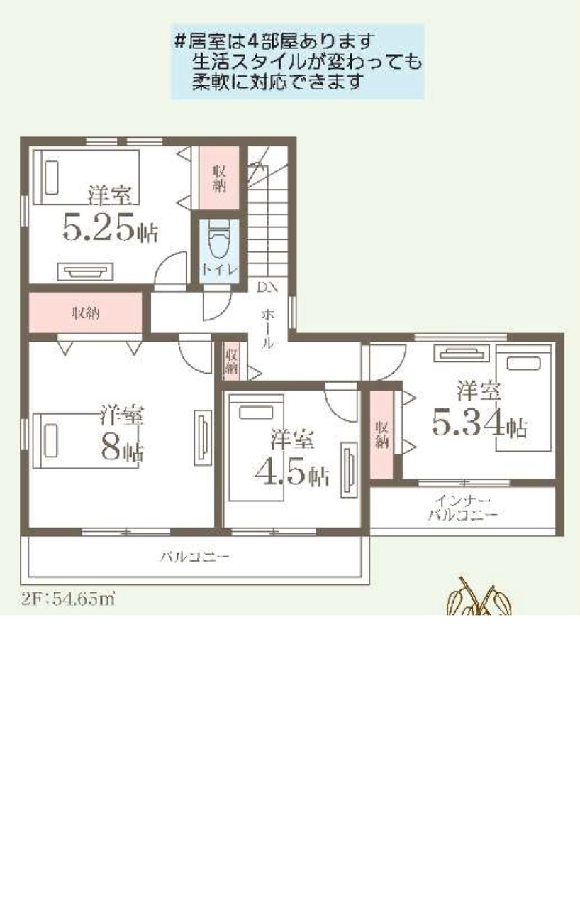 | 間取 | 4LDK + SIC・パントリー (LDK18.75帖、洋室8.0帖、洋室5.25帖、洋室5.34帖、洋室4.5帖) | ||