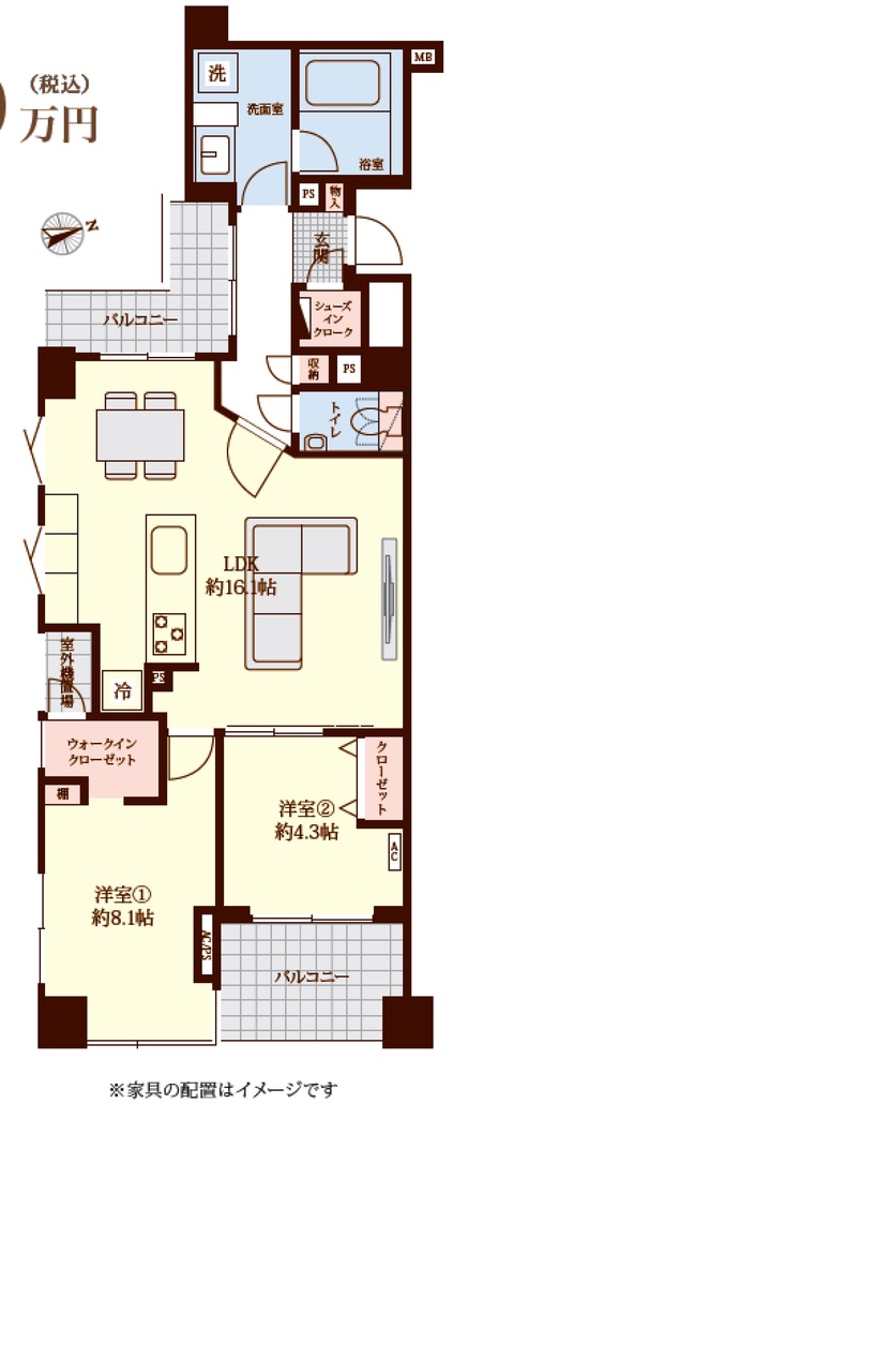 | 間取 | 2LDK + WIC (LDK16.1帖、洋室8.1帖、洋室4.3帖) | ||
