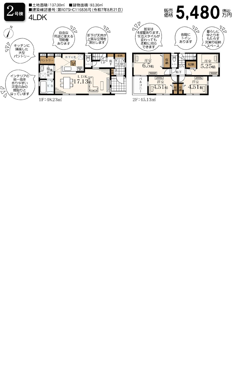 | 間取 | 4LDK (LDK17.13帖、洋室6.5帖、洋室5.25帖、洋室4.51帖、洋室4.51帖) | ||