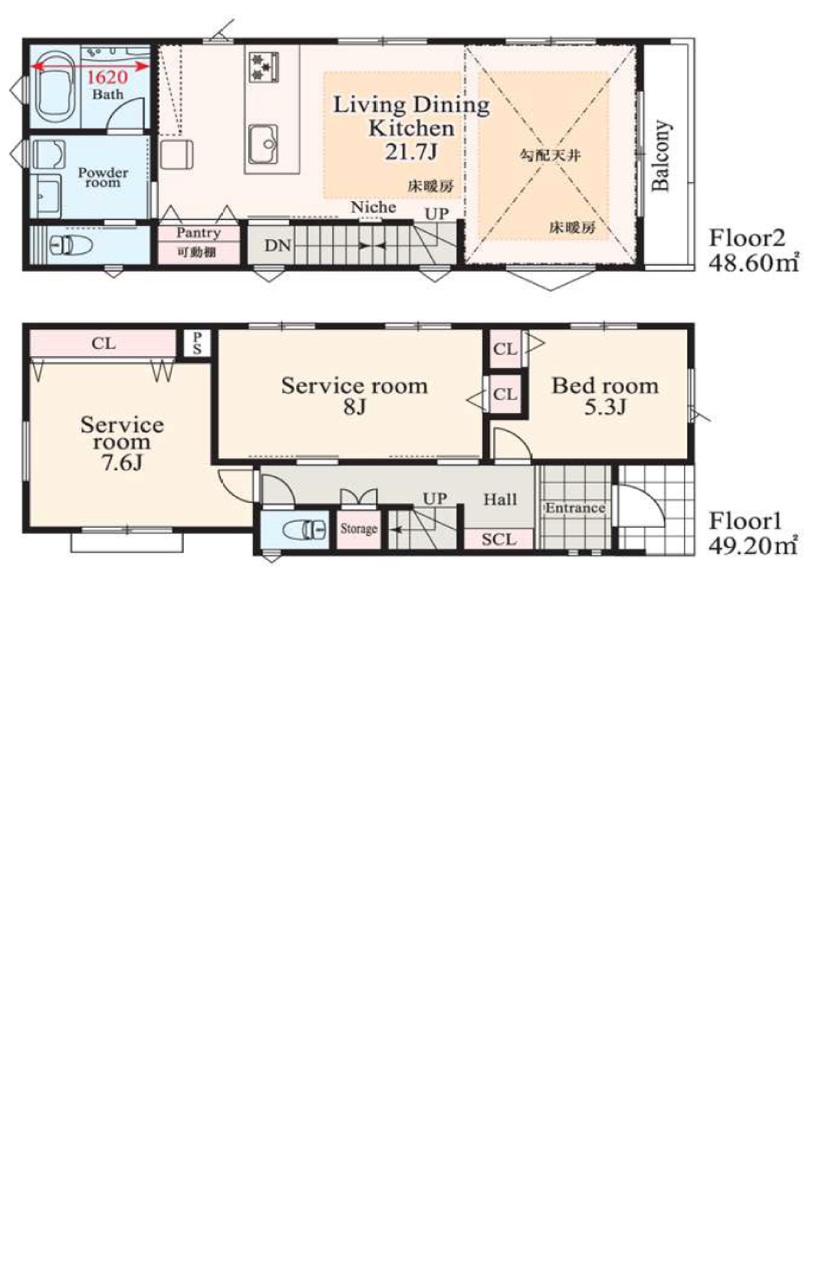 | 間取 | 1SLDK + S×2 (LDK21.7帖、洋室5.3帖、S8.0帖、S7.6帖) | ||