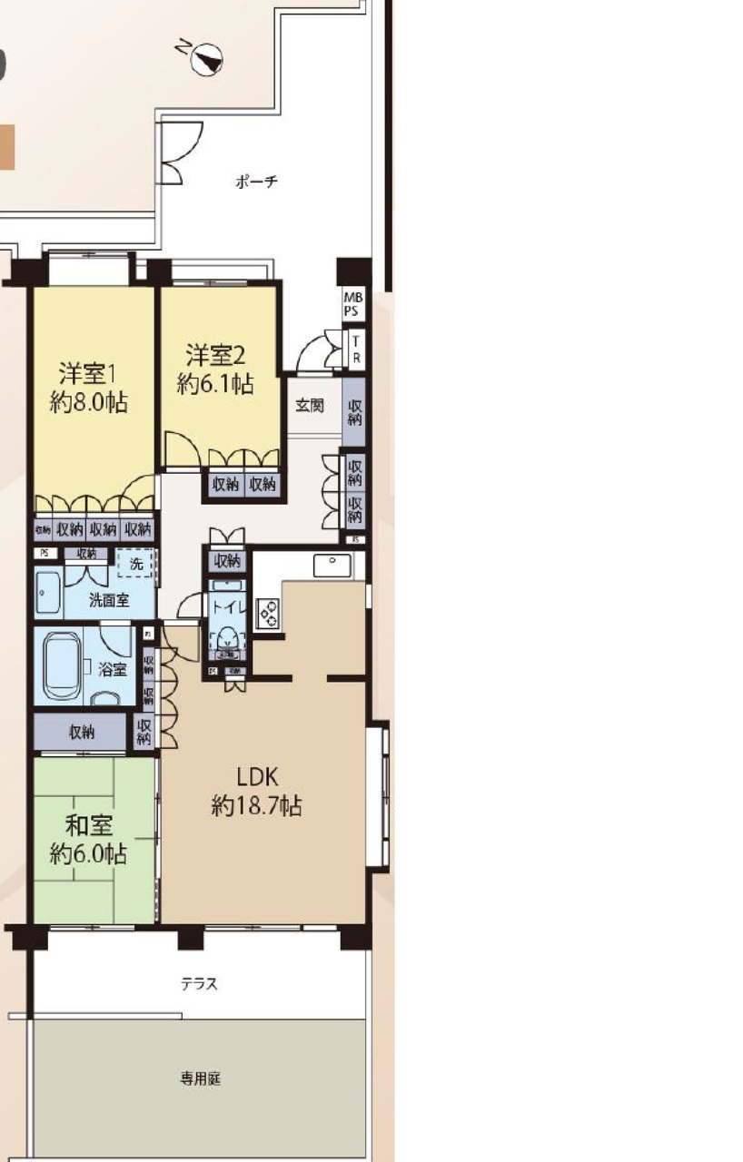 | 間取 | 3LDK (LDK18.7帖、和室6.0帖、洋室8.0帖、洋室6.1帖) | ||