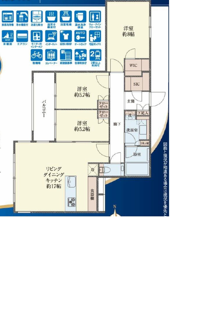 | 間取 | 3LDK + WIC・SIC (LDK17.0帖、洋室8.0帖、洋室5.7帖、洋室5.7帖) | ||
