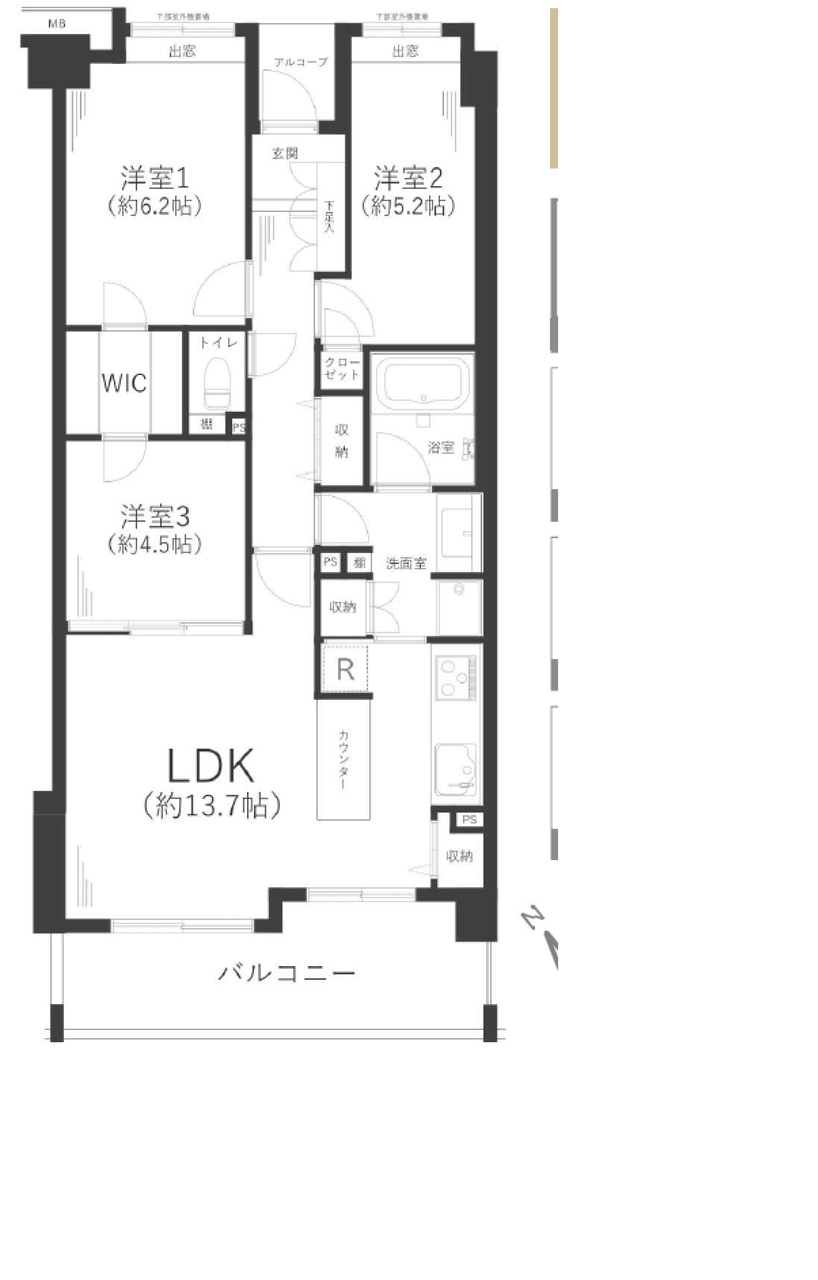 | 間取 | 3LDK (LDK13.7帖、洋室6.2帖、洋室5.2帖、洋室4.5帖) | ||