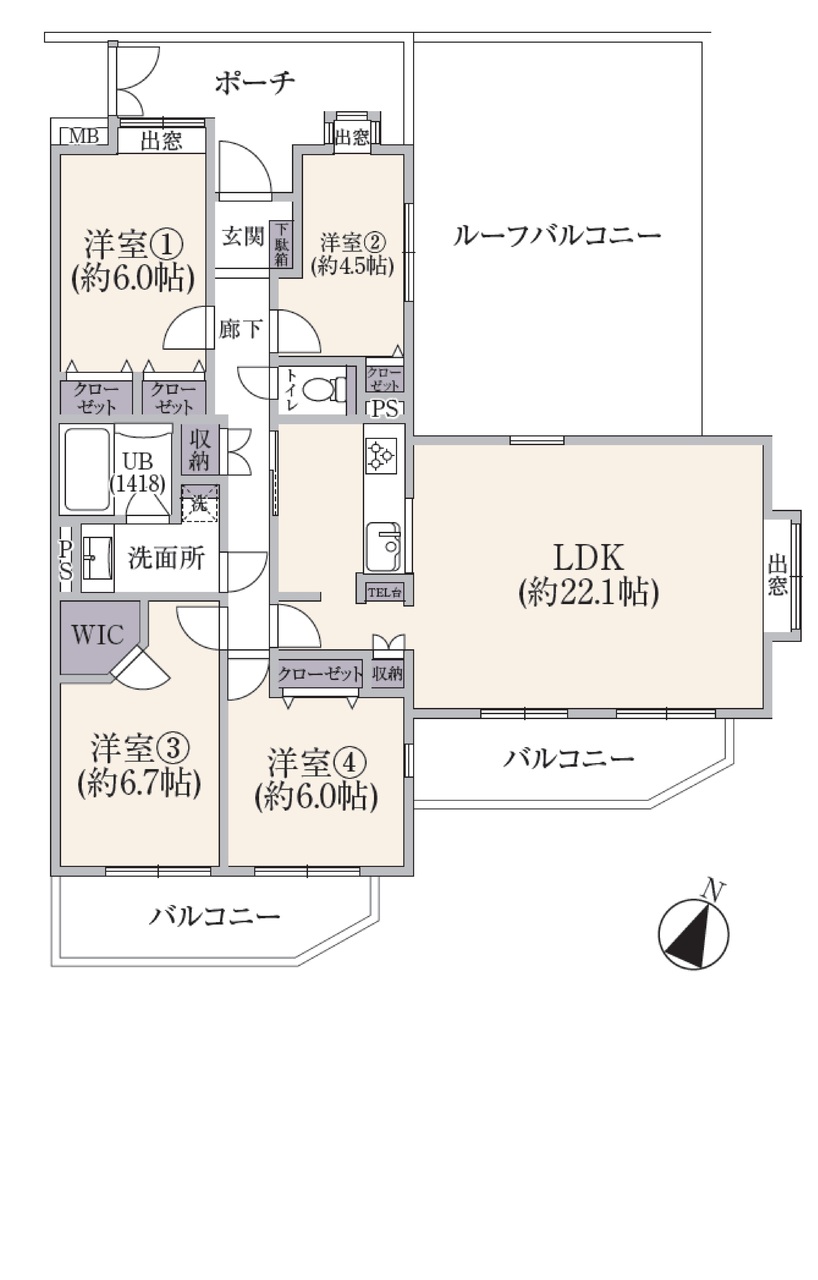 | 間取 | 4LDK + ルーフバルコニー・WIC (LDK22.1帖、洋室6.0帖、洋室6.7帖、洋室6.0帖、洋室4.5帖) | ||