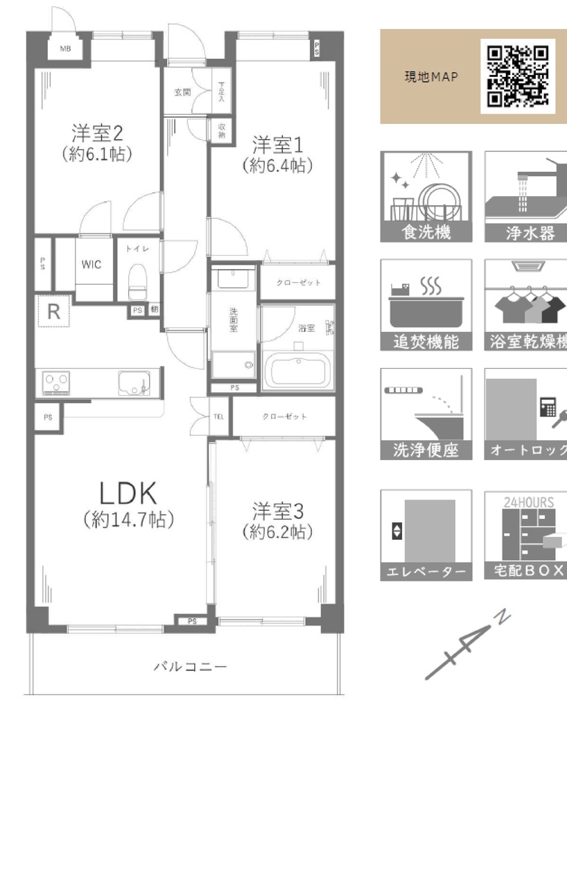 | 間取 | 3LDK + WIC (LDK14.7帖、洋室6.4帖、洋室6.1帖、洋室6.2帖) | ||